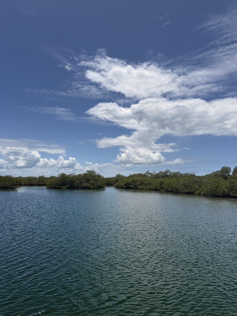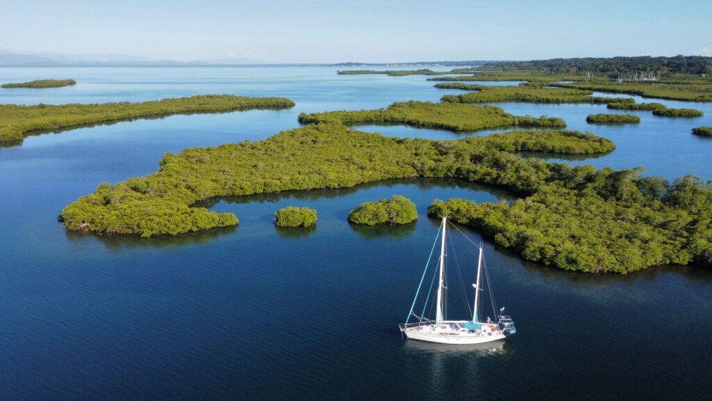 As Ken and Sandra arose, our mood was high, as the morning was so pleasant, the surroundings outstanding, and only a slight southerly breeze disturbed the placid waters with cat paws lazily flowing across the surface. The mountains of Panama were clearly visible in the distance all the way up to the border of Costa Rica, capped with a scattered array of cumulus drifting with the upper level winds. Ken pulled out his drone and captured some images of Galini in the mangroves that poignantly heighten the majesty of our surroundings. Places like these are only available to those with the patience to find them. I remind myself how grateful I am to have good friends, a wonderful boat, and a heart that allows me the freedom to enjoy this serenity.