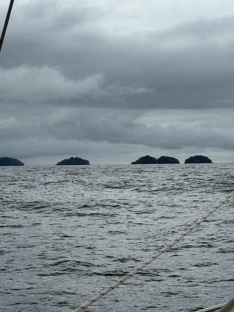 We had approximately 70 nm to traverse so we had adopted an overnight passage to arrive early morning at the region. The PredictWind models called for little wind, light shifting currents, so a motor-sail was in order. We settled for sailing along the coast and found a dynamic breeze of 6-10kts mostly just off the bow, which left us with a mizzen and main sail set, tightly hauled and engine purring at 1100 rpm. Started off well, with 6 kts of boat speed but as we ventured NE up the Panamanian coast, the current increased along with the wind up to 15 – 17kts on the nose and our boat speed continued to drop significantly even with additional engine power and we found ourselves crawling along at 2 – 3kts SOG for much of the night. Weather models showed even more counter current if we went further offshore and to change course NW to take advantage of the wind would only increase our distance needed to travel so we plunged forward. In addition, a nasty confused sea state set in and Galini was rocked in a chaotic motion, so it was quite uncomfortable aboard. What was supposed to be a leisurely overnight passage to a beautiful cruising ground holiday vacation was starting out tough.
